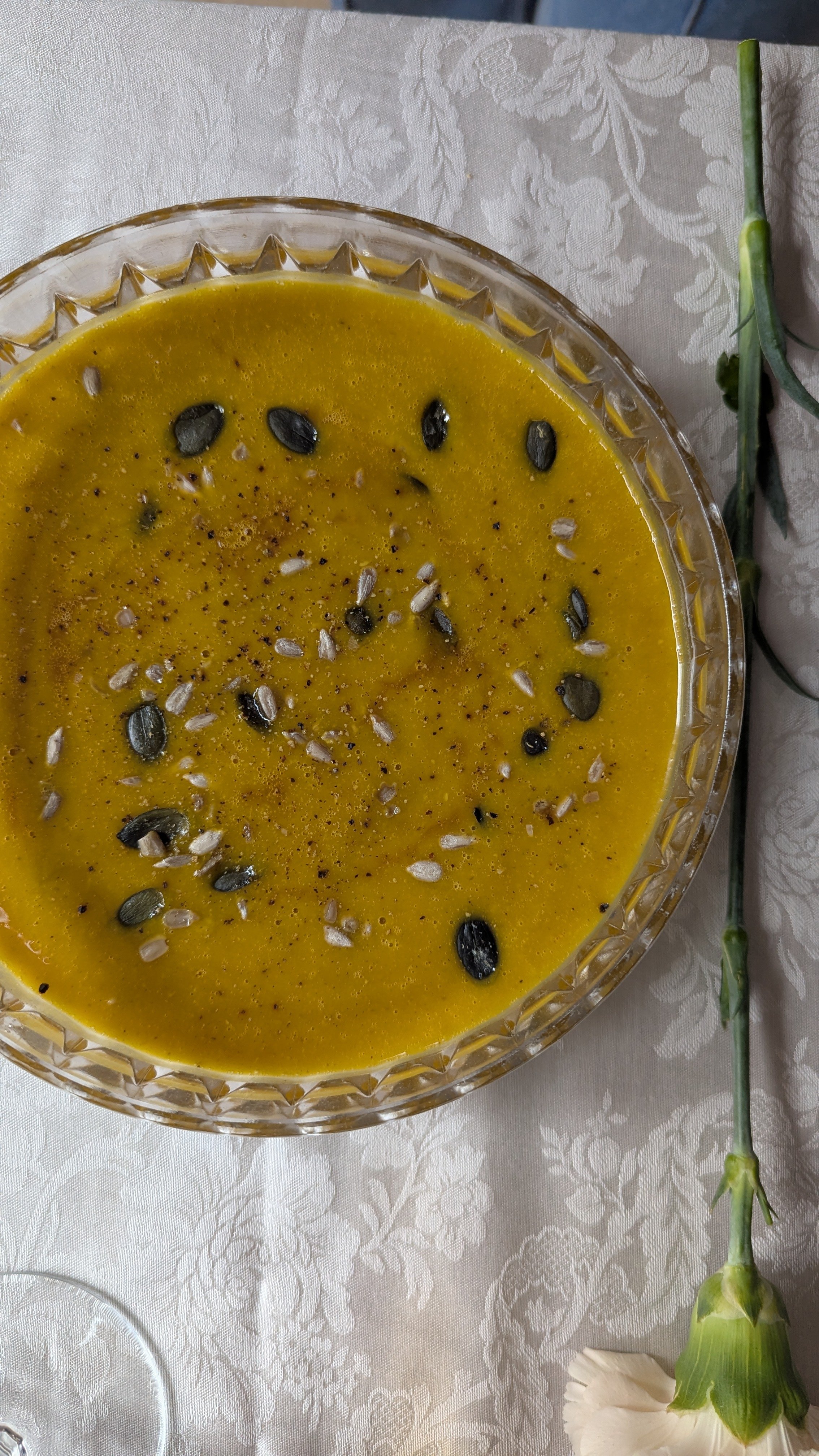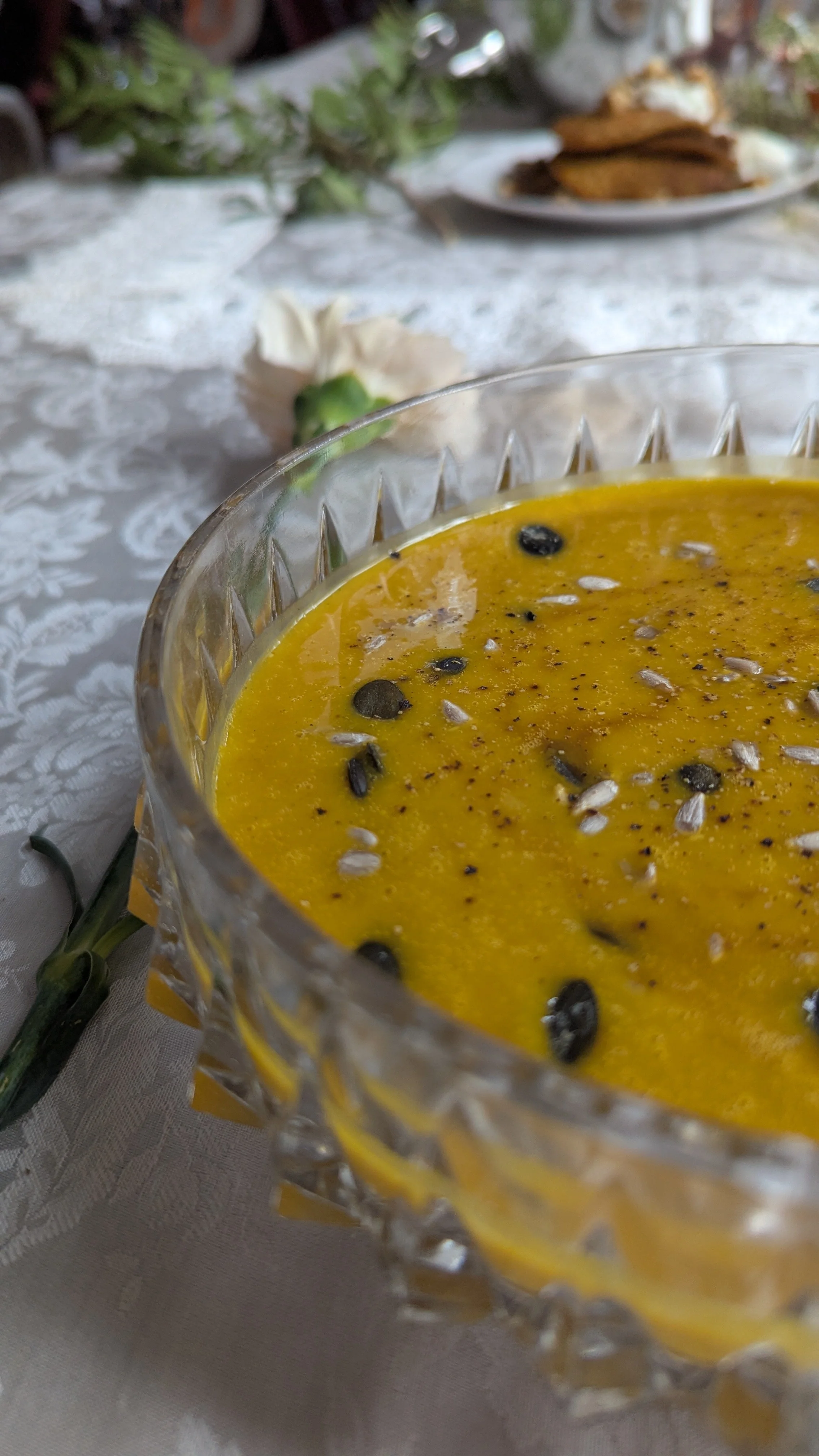 A comforting and velvety soup blending sweet pumpkin with hearty red lentils, gently spiced with cumin, curry powder, and fragrant sage. Cooked in a rich shiitake broth with coconut oil, onions, and shallots, this soup is both nourishing and full of depth of flavor.