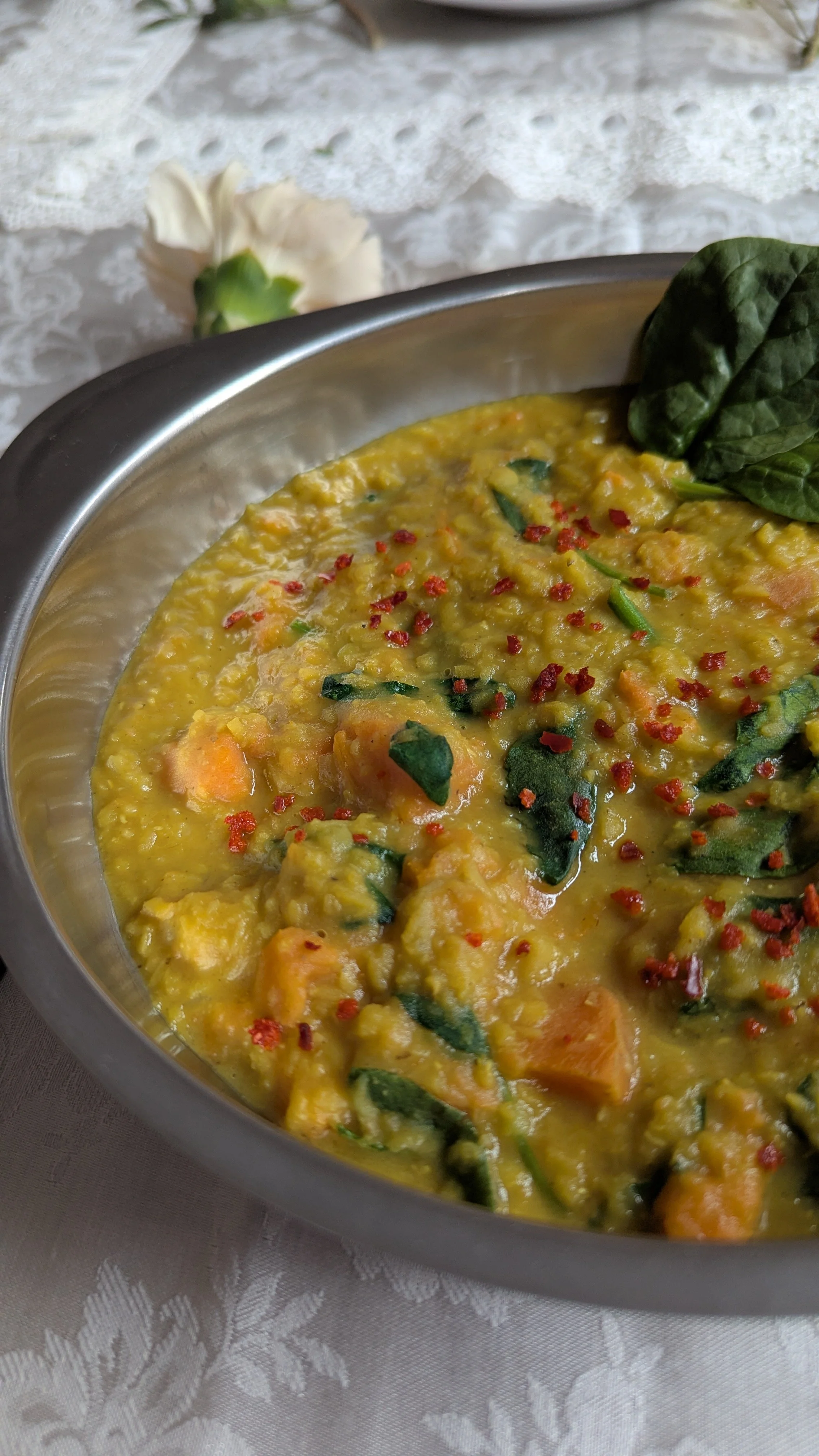 Red lentils are rich in iron and protein—key for rebuilding postpartum strength and energy. Sweet potatoes provide complex carbohydrates and beta-carotene to support recovery and steady energy. Spices like turmeric and cumin aid digestion and help reduce inflammation. This bowl is soft, comforting, and deeply satisfying—everything your postpartum body craves.